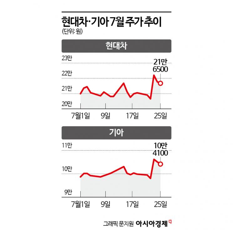 28일 한국거래소에 따르면 현대자동차는 지난 23일 22만2000원을 기록한 후 25일 21만6500원으로 내려왔다. 기아도 10만6100원에서 10만4100원으로 밀렸다. 현대차와 기아 모두 2일 연속 하락이다. 현대차와 기아는 올해 4월 연중 최저가인 17만7500원과 8만2000원을 기록한 후 지속해서 반등하고 있었다.