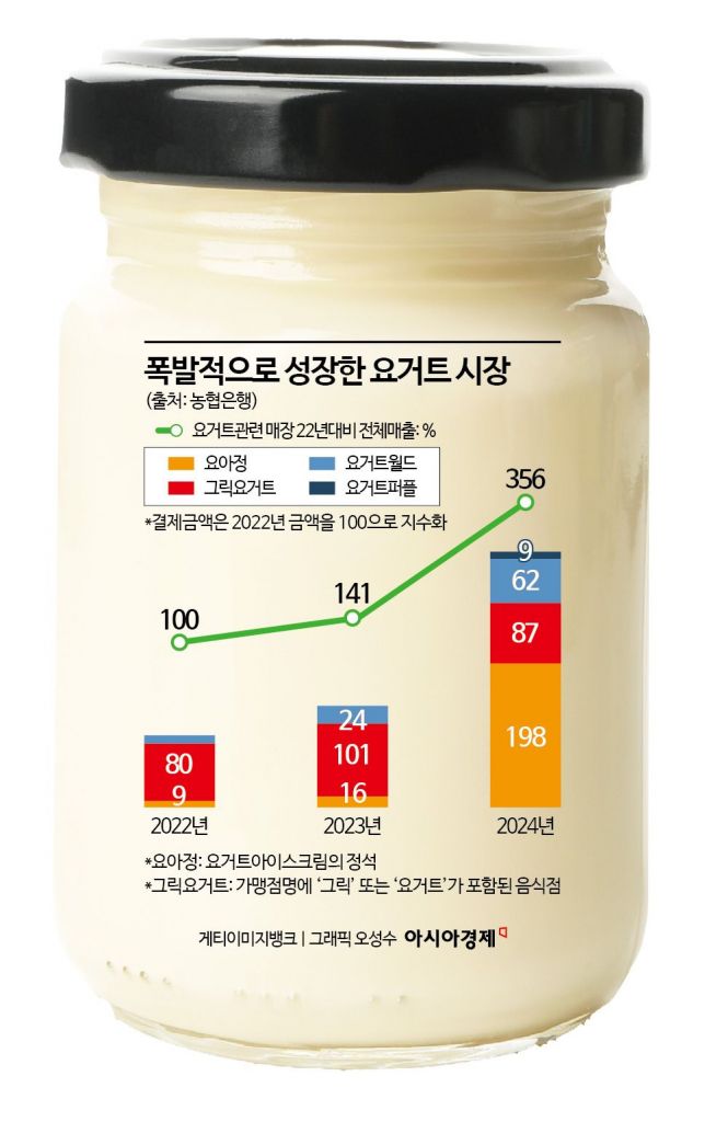 28일 금융권에 따르면 농협은행은 2022년부터 지난해까지의 'NH멤버스 회원 하나로마트 유제품 소비 데이터'(840만명·2억300만건) 및 '농협카드 요구르트 전문 매장 결제 내역'(40만명·77만건)을 분석한 결과를 최근 내놨다. 이 결과를 보면 요구르트 관련 매장 전체 매출은 2022년에 비해 지난해 256% 상승했다. 2022년 매출액을 100으로 환산했을 때 2023년 141, 지난해 매출액이 356에 이르렀다.