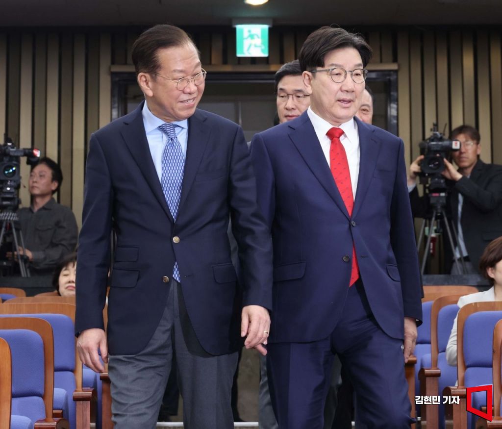 권영세 국민의힘 비상대책위원장과 권성동 원내대표가 8일 국회에서 열린 의원총회에 참석하고 있다. 2025.5.8김현민 기자