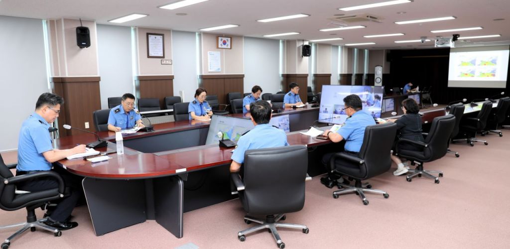서해지방해양경찰청은 25일 제7호 태풍(프란시스코), 제8호 태풍(꼬마이) 북상과 관련, 청사 대회의실에서 해양사고 대비 대응을 위한 화상회의를 개최했다.