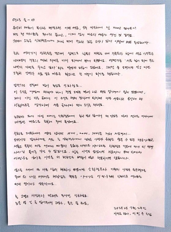 그룹 신화의 이민우가 26일 자신의 SNS에 올린 손편지. 인스타그램 캡처