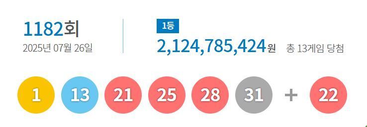 로또복권 운영사 동행복권은 제1182회 로또 추첨 결과 1등 당첨번호가 '1, 13, 21, 25, 28, 31'이라고 26일 밝혔다.