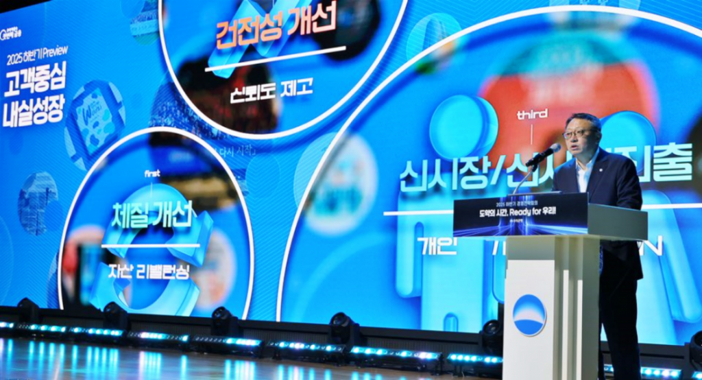 지난 25일 서울 회현 우리은행 본점에서 열린 ‘2025년 하반기 경영전략회의’에서 정진완 우리은행장이 상반기 성과를 점검하고, 하반기 경영 전략을 제시하고 있다. 우리은행