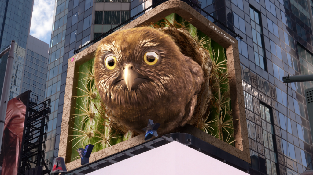 LG전자는 미국 뉴욕 타임스스퀘어 전광판에서 '피그미 올빼미'를 주제로 한 ‘LG와 함께하는 위기 동물 보호 캠페인’ 일곱 번째 영상을 공개했다. 이번 영상은 이상기후 등으로 서식지를 위협받는 '피그미 올빼미'의 모습을 3D로 보여주며 환경 파괴의 심각성을 알린다. LG전자