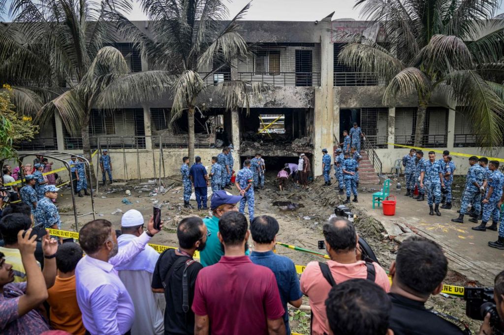 방글라데시 사람들이 2025년 7월 22일 방글라데시 다카의 마일스톤 칼리지 캠퍼스에 공군 훈련용 항공기가 추락한 후 불에 탄 학교 건물을 바라보고 있다. 7월 21일 다카의 마일스톤 스쿨 앤 칼리지에서 발생한 항공기 추락 사고로 인한 사망자 수가 31명으로 증가했다. 이 사고로 165명이 부상을 입었다. EPA연합뉴스