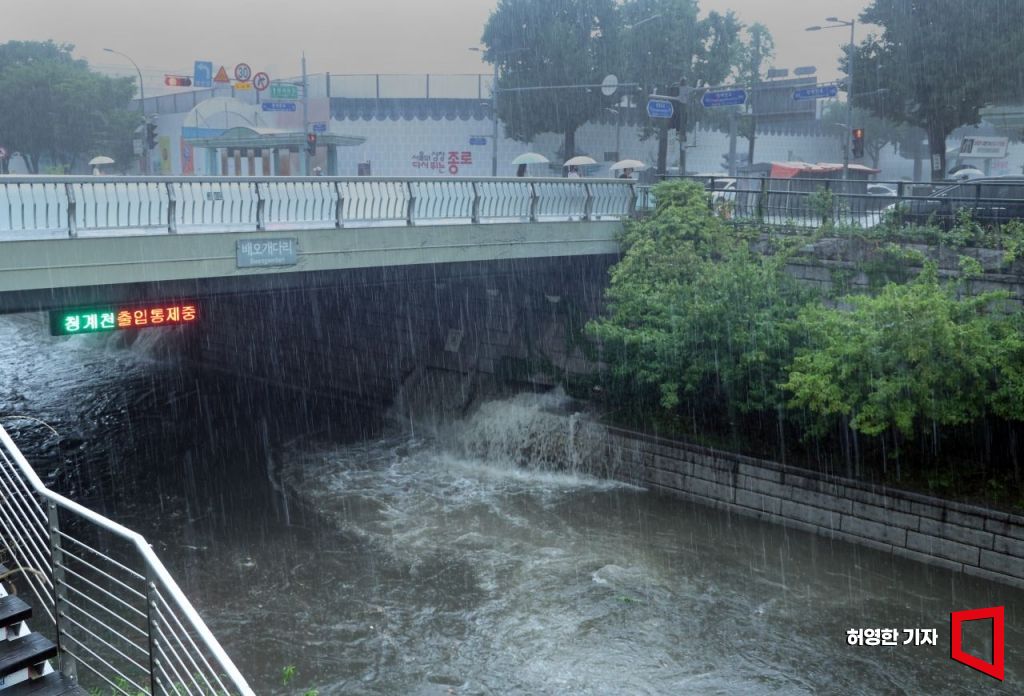 수도권지역에 많은 비가 내린 17일 오전 서울 청계천 지류에서 빗물이 쏟아져 들어와 청계천 산책로에 물이 넘쳐 출입이 통제됐다.