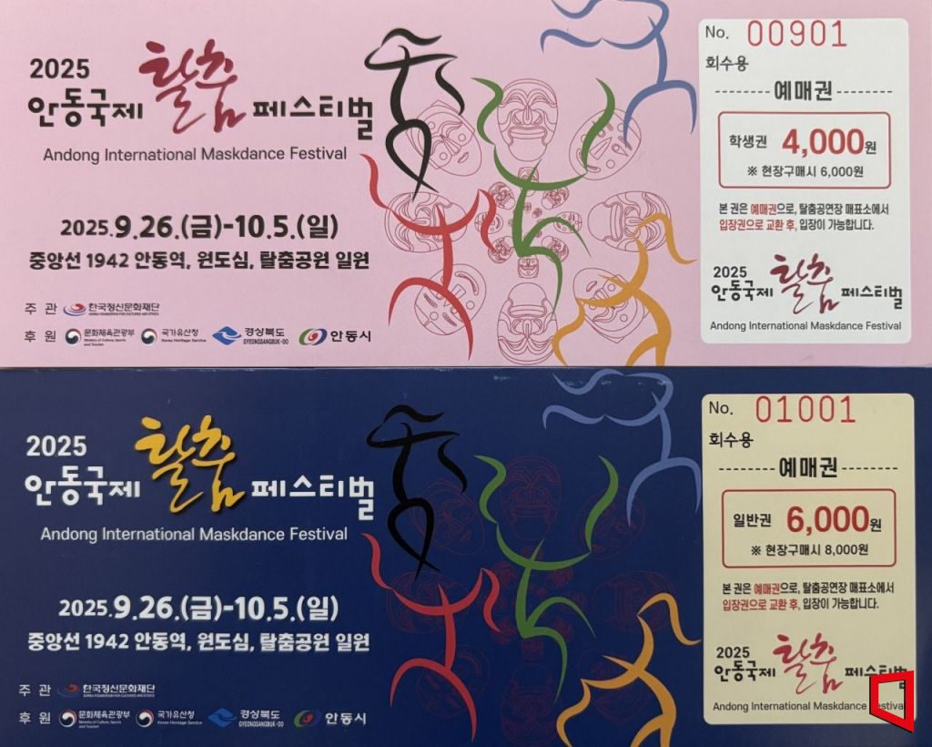 예매권은 네이버·카카오톡 등 주요 포털 플랫폼을 통한 온라인 예매와 함께 안동시청 종합민원실, 24개 읍면동 행정복지센터, 지정된 판매처에서 오프라인으로도 구매할 수 있다. 구매한 예매권은 축제 기간 중 현장 매표소에서 입장권으로 교환 후 사용할 수 있다.