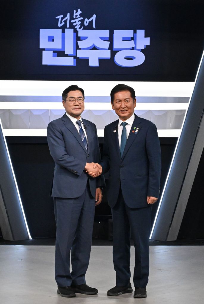 더불어민주당 당 대표 선거에 출마한 박찬대(왼쪽), 정청래 후보가 27일 오후 서울 영등포구 여의도 KBS 신관 공개홀에서 2차 텔레비전 토론회 시작 전 악수를 하고 있다. 국회사진기자단 연합뉴스