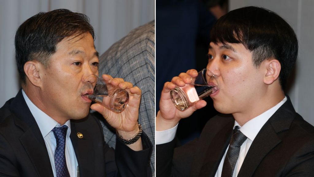 25일 서울 중구 플라자호텔에서 열린 수련협의체 첫 회의에 이형훈 보건복지부 제2차관(왼쪽)과 한성존 대한전공의협의회(대전협) 비대위원장이 참석해 있다. 연합뉴스