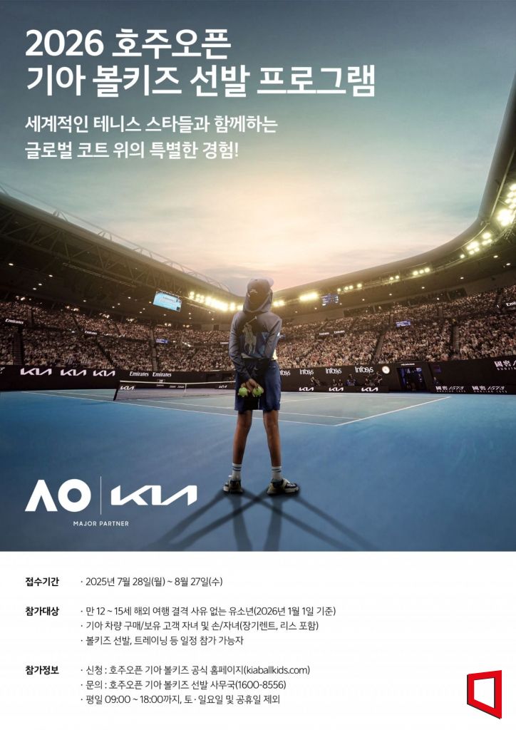 기아는 내년 1월 '2026 호주오픈'에서 볼키즈로 활약할 유소년을 모집한다고 28일 밝혔다. 볼키즈는 테니스 경기 중 경기장 내에서 볼의 처리와 수급 등 원활한 경기 운영을 돕는다.