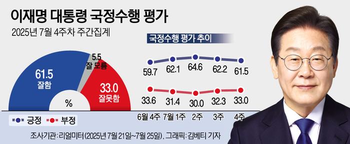 이재명 대통령의 국정 지지율이 61.5%를 기록했다는 여론조사 결과가 28일 나왔다.