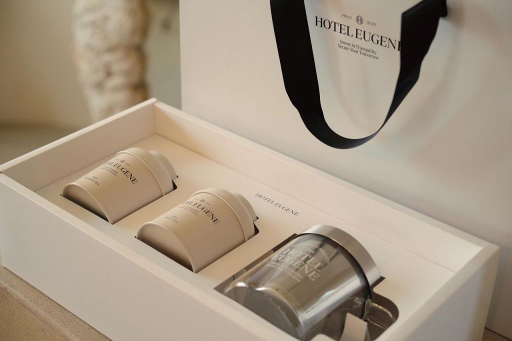 유진투자증권이 ‘고객 동반자’라는 브랜드 철학을 담은 굿즈 시리즈 ‘호텔유진(HOTEL EUGENE)’을 출시했다. 호텔유진(HOTEL EUGENE) 티세트 굿즈 이미지.