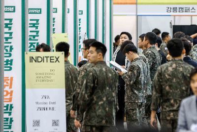7일 경기 고양 킨텍스에서 열린 '2025년 국군장병 취업박람회'에 참가한 국군장병들이 취업 관련 설명을 듣고 있다. 2025.5.7. 강진형 기자