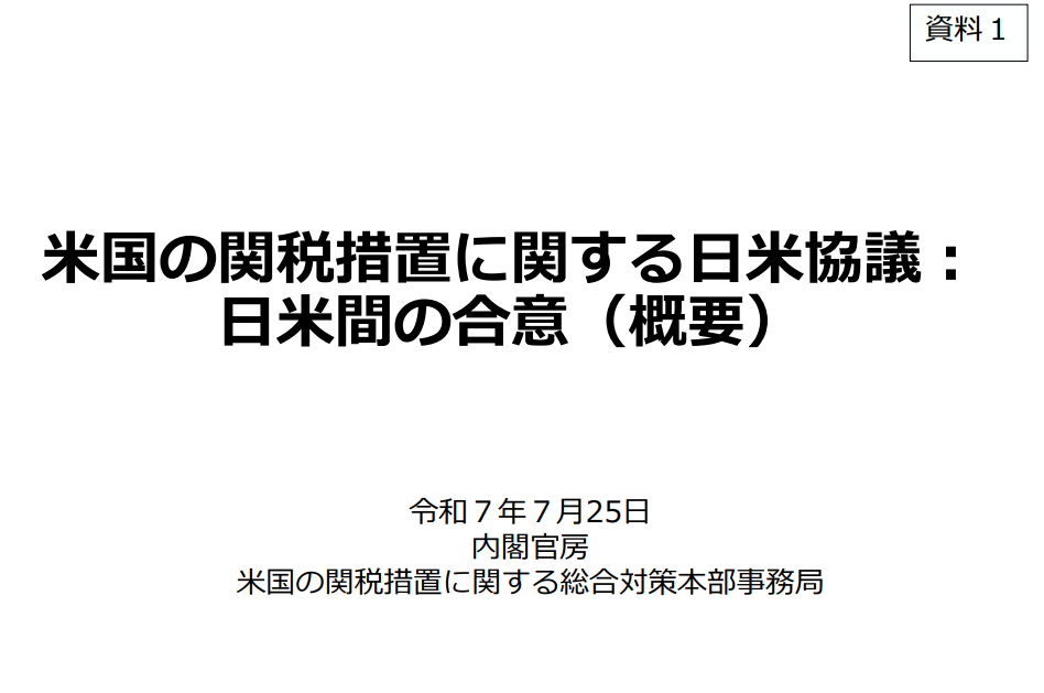 자동차 분야에서 일본의 양보는 두드러진다. 현재 자동차의 MFN 세율은 2.5%에 불과하지만 추가관세를 절반으로 감면하는 방식으로 최종 15% 수준이 적용됐다. 개요문은 또 "일본 기업의 미국 투자 등을 통한 경제안보상 중요한 9개 분야에서 미·일이 협력한다"고 명시했다.