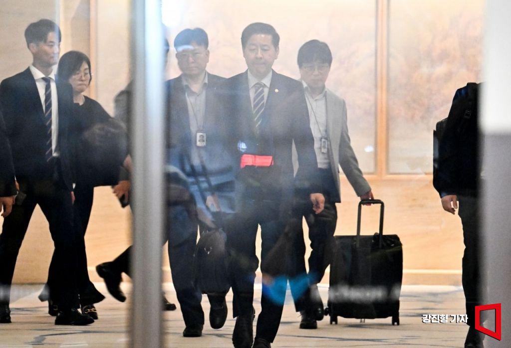 미국 측의 요청으로 한미 2+2 통상 협의가 돌연 연기된 24일 인천국제공항 제2여객터미널에서 구윤철 경제부총리 겸 기획재정부 장관이 출국을 취소하고 공항을 나서고 있다. 2025.7.24. 강진형 기자