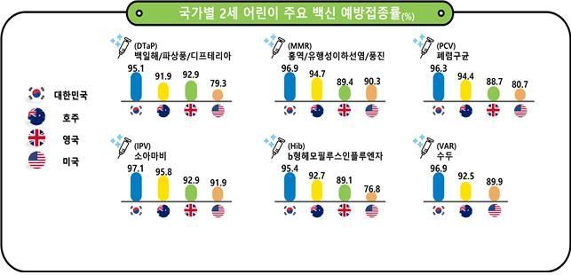 백일해·파상풍·디프테리아(DTaP), 홍역·유행성이하선염·풍진(MMR), 폐렴구균(PCV) 등 국내 주요 백신 6종 예방 접종률은 미국, 영국, 호주 등 해외 주요국과 비교했을 때 모두 1~19%포인트 더 높았다.