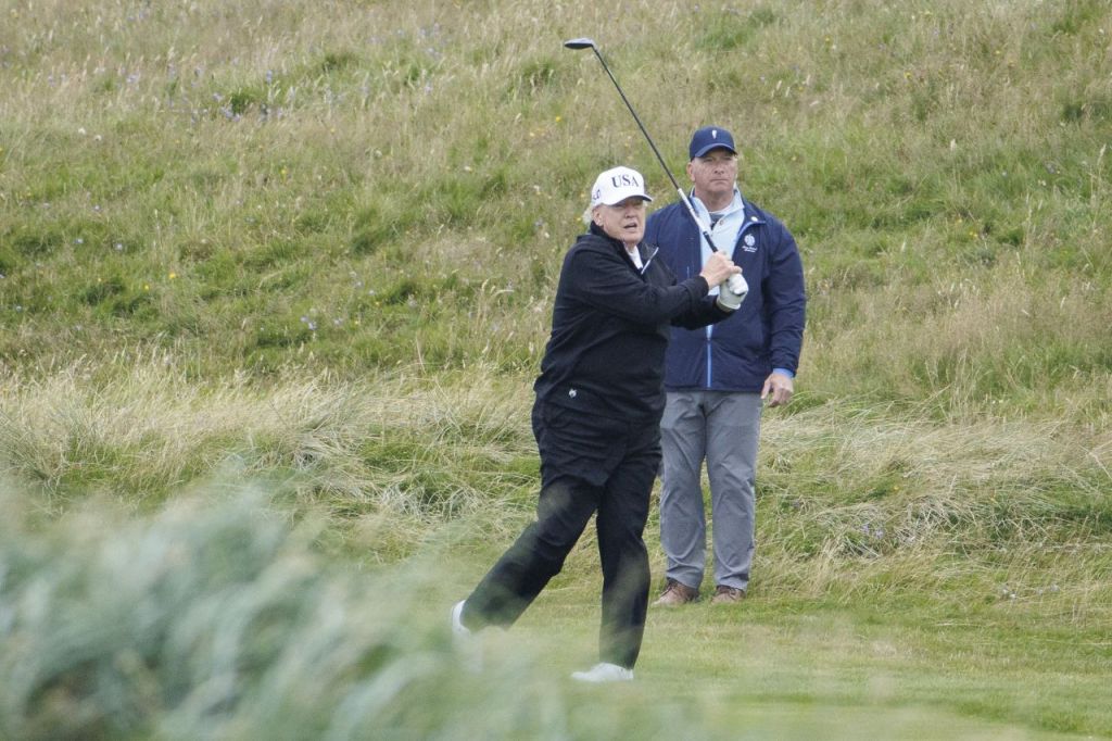 도널드 트럼프 미국 대통령이 영국 스코틀랜드 턴베리 골프클럽에서 티샷을 하고 있다. 턴베리=EPA연합뉴스