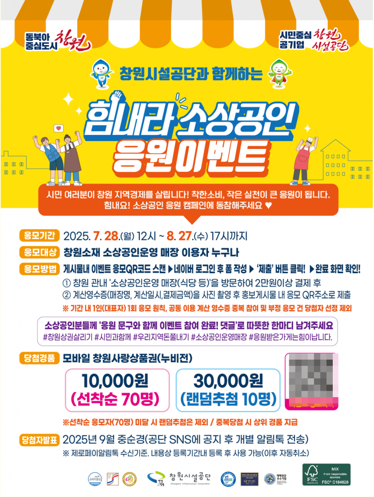 경남 창원시설공단이 정부의 민생회복 소비쿠폰 지급에 맞춰 '소상공인 응원 이벤트'를 실시한다.