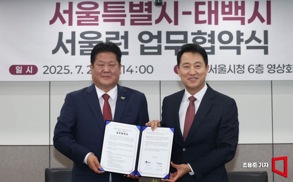 오세훈 서울시장(오른쪽)과 이상호 태백시장이 28일 서울 중구 서울시청 영상회의실에서 교육격차 해소를 위한 업무협약식을 갖고 있다. 이번 협약으로 서울런 플랫폼을 공동 활용해 지역 청소년 500명에게 양질의 온라인 학습 서비스를 제공한다.