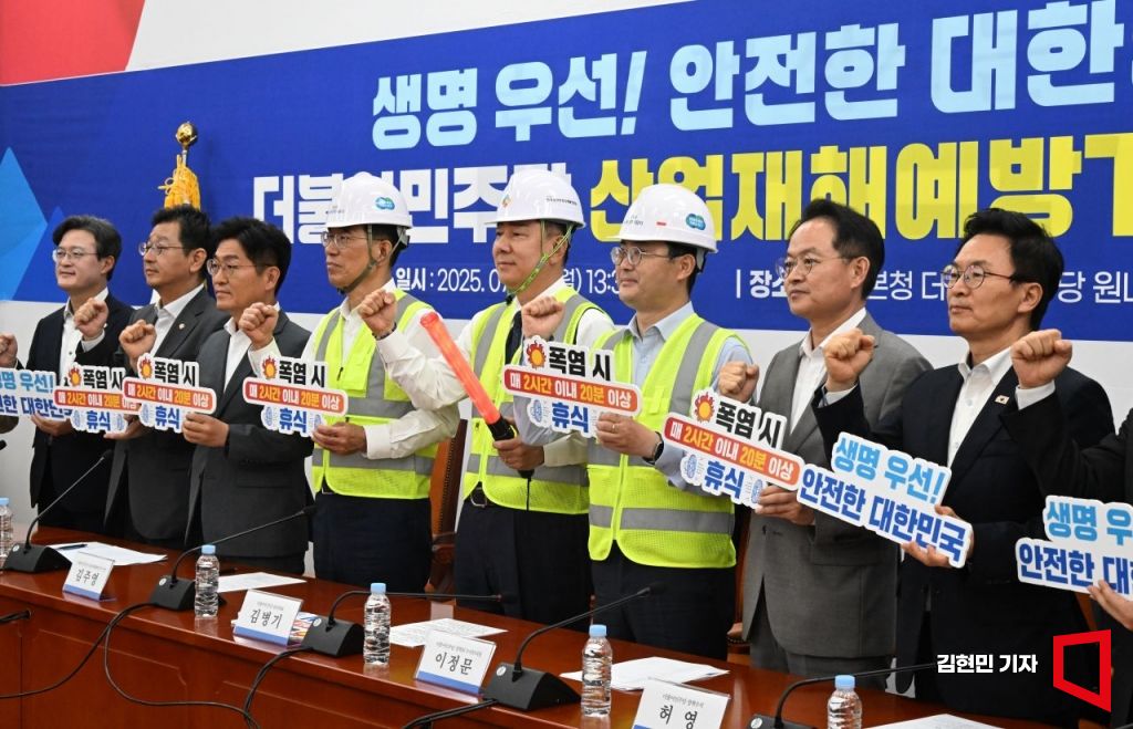 김병기 당대표 직무대행 겸 원내대표를 비롯한 더불어민주당 의원들이 28일 국회에서 열린 산업재해 예방 TF 출범식에서 안전 퍼포먼스를 하고 있다. 김현민 기자
