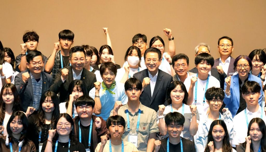 김영록 전라남도지사가 28일 오후 광양 문화예술회관에서 열린 ‘제14회 최수종과 함께하는 전남연기캠프 입소식’에 참석, 연기캠프에 입소한 도내 청소년들과 기념촬영을 하고 있다. 전남도 제공