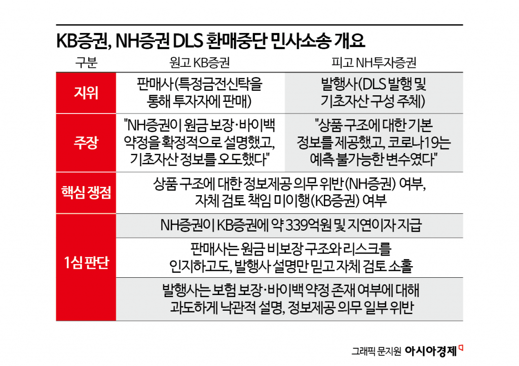 1심은 두 증권사에 각각 다른 성격의 책임이 있다고 판단했다. 지난 2월 1심 재판부는 "NH증권이 KB증권에 339억원 및 이자를 배상하라"고 판결했다.
