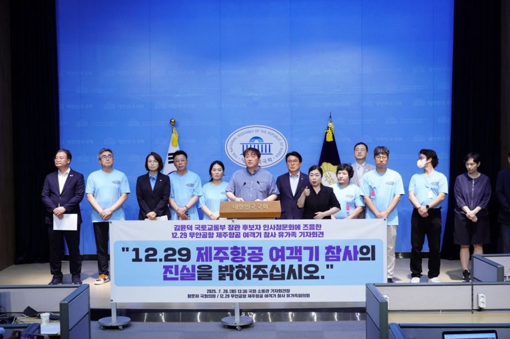 12·29 무안공항 제주항공 여객기 참사 유가족 협의회(이하 '협의회')는 28일 국회 소통관에서 기자회견을 열고 "김윤덕 국토교통부 장관 후보자는 국토부가 반복해온 진실 은폐 관행을 끊고, 참사의 근본 원인 규명과 재발방지 대책 마련에 책임 있게 나서달라"고 요구했다.