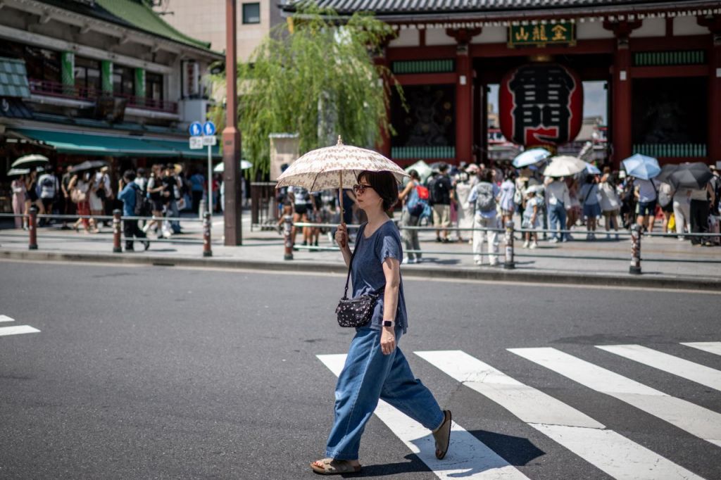 28일 도쿄 센소지 근처 아사쿠사 거리에서 한 행인이 양산을 쓰고 걷고 있다. AFP 연합뉴스