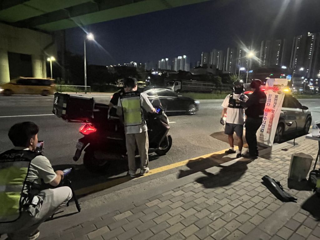 시흥시 합동단속반이 야간 단속에서 배달오토바이의 소음과 불법개조 여부를 확인하고 있다. 시흥시 제공