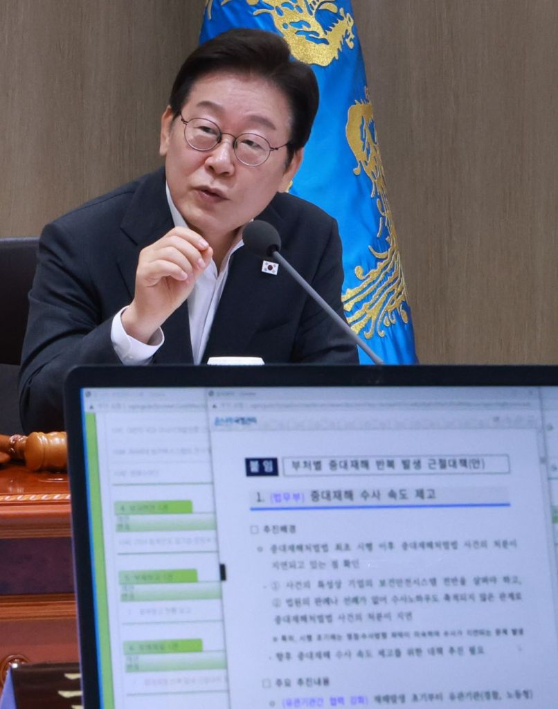 이 대통령은 "올해부터 산재 사망 근절 원년이 됐으면 좋겠다"면서 부처 장관들과 대책을 논의했다. 이 대통령은 김영훈 고용노동부 장관으로부터 보고받은 뒤 "형사처벌에 한계가 있는 것 같다"면서 "지출이 늘어나게 만들어야 한다"고 분석했다. 이어 "상습적, 반복적 사고가 발생했다면 고의에 가까운 것인데 징벌 배상을 도입하는 것도 검토해야 한다"며 "고액 과징금이라든지 경제적 제재를 가해야 (기업들이) 실제 예방에 나서지 않을까 (생각한다)"고 강조했다.