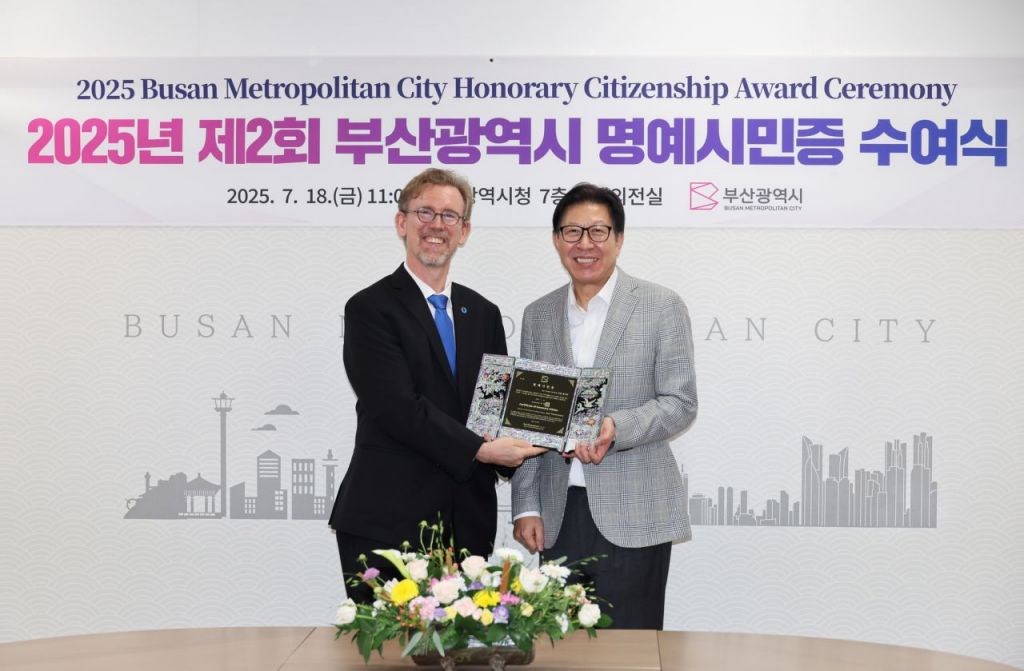 악셀 팀머만 IBS 기후물리연구단장이 지난 18일 박형준 부산 시장으로부터 명예 부산 시민증을 받고 있다. 사진=IBS