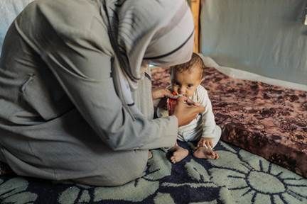 가자지구 샴스(Shams) 캠프에서 국제구조위원회가 제공한 영양실조 치료식(RUFT)을 10개월 된 자녀에게 먹이고 있는 어머니의 모습. 국제구조위원회