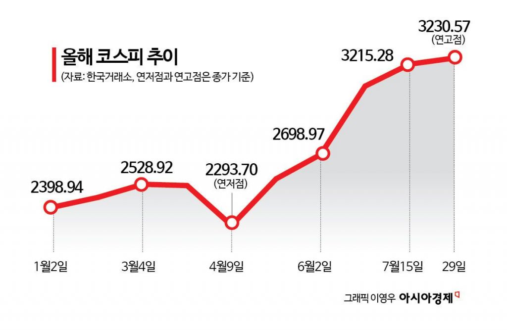 30일 한국거래소에 따르면 코스피는 전일 0.66% 오른 3230.57로 마감하며 연고점을 다시 썼다. 그동안 3200선에서 등락을 거듭했던 코스피는 최근 5일 연속 상승하며 3200선에 안착하는 모습이다.