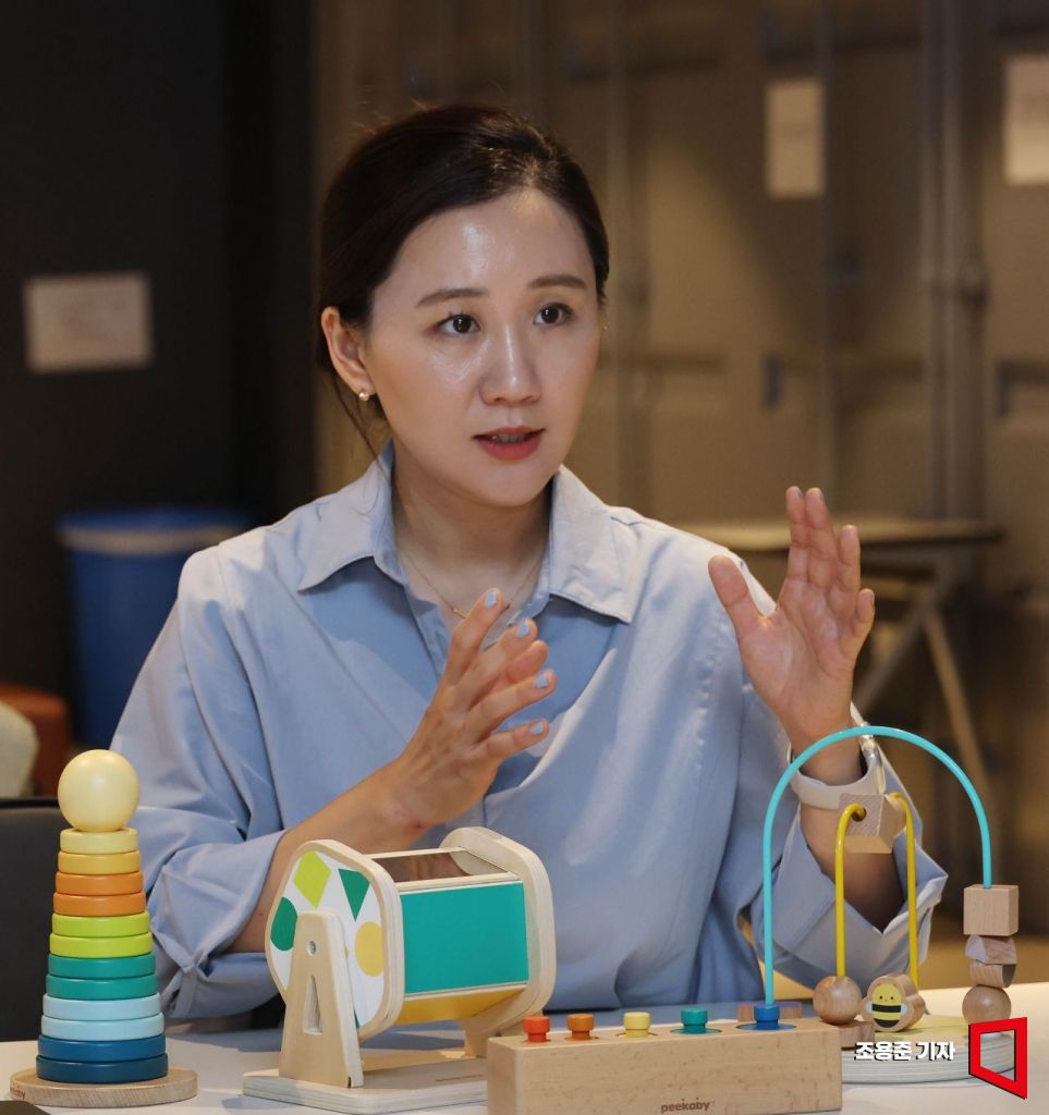 허청아 올디너리매직 대표가 자사 브랜드 '피카비' 놀잇감의 사용 방법에 대해 설명하고 있다. 조용준 기자