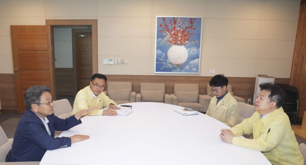 강기정 광주시장이 29일 오전 시청 접견실에서 김용균 행정안전부 안전정책실장과 이선무 중앙합동조사단 광주반장을 만나 피해지역의 신속한 특별재난지역 지정과 국고 지원 필요성을 강조하고 있다. 광주시 제공