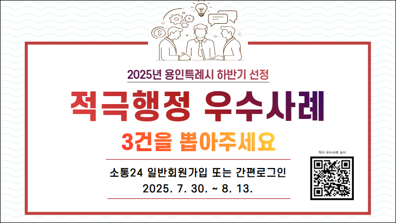 용인시는 30일부터 다음 달 13일까지 '2025년 하반기 적극행정 우수사례' 선발을 위한 온라인 국민심사를 진행한다고 밝혔다.