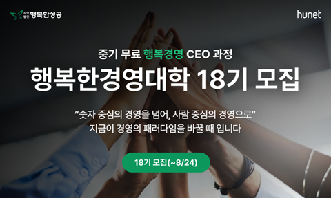 휴넷이 후원하는 사단법인 행복한성공은 중소·중견·벤처기업 최고경영자(CEO)를 대상으로 한 무료 CEO 과정 '행복한경영대학' 18기 수강생을 모집한다고 30일 밝혔다.