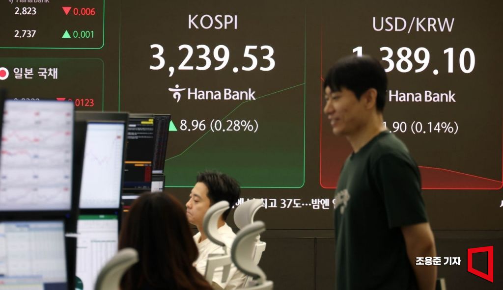 코스피 지수가 4년 만에 최고치를 넘어서며 연일 기록을 경신하고 있는 가운데 30일 서울 중구 하나은행 딜링룸 모니터에 코스피를 비롯해 원/환율 등이 표시돼 있다. 이날 코스피는 장 초반 3,235대에서 강보합세를 보이고 있다. 오전 9시 2분 현재 코스피는 전장보다 7.53포인트(0.23%) 오른 3,238.10을 보이고있다.