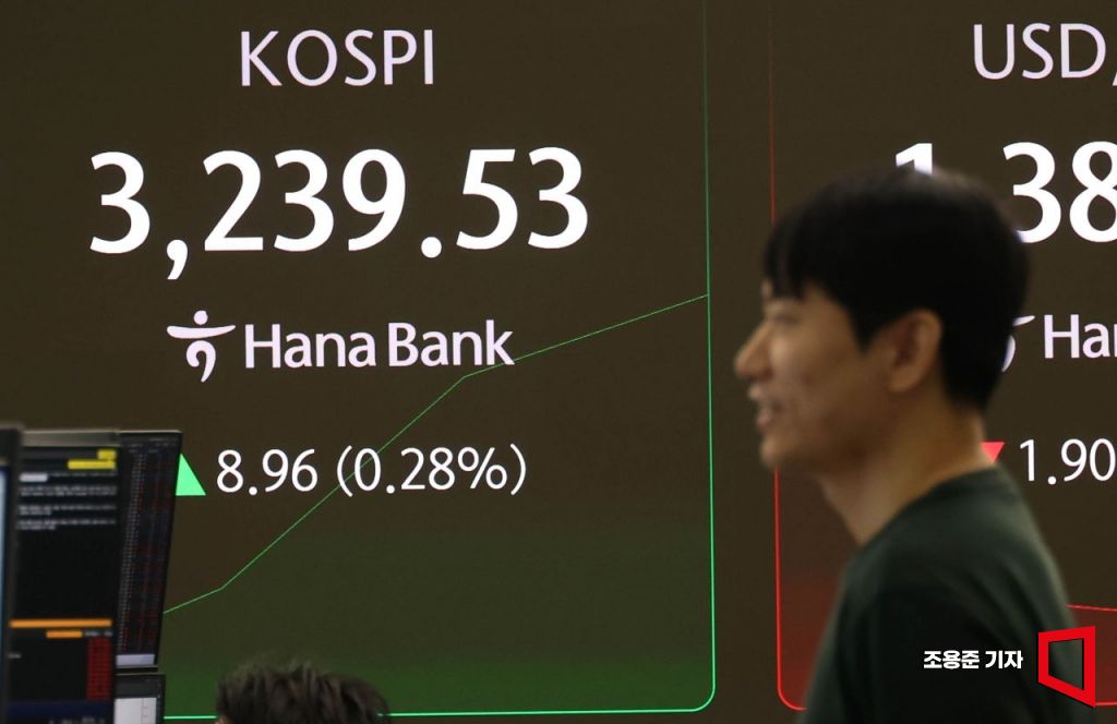 코스피 지수가 4년 만에 최고치를 넘어서며 연일 기록을 경신하고 있는 가운데 30일 서울 중구 하나은행 딜링룸 모니터에 코스피를 비롯해 원/환율 등이 표시돼 있다. 이날 코스피는 장 초반 3,235대에서 강보합세를 보이고 있다. 오전 9시 2분 현재 코스피는 전장보다 7.53포인트(0.23%) 오른 3,238.10을 보이고있다.