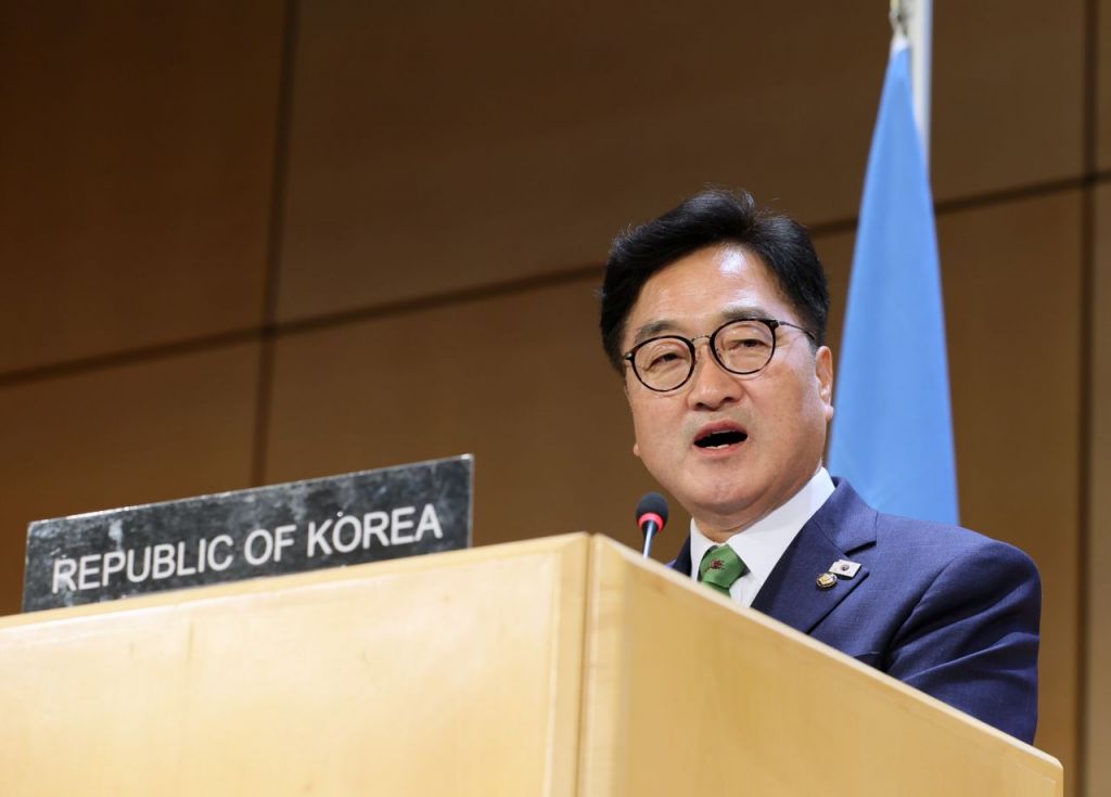 우원식 국회의장이 29일(현지시간) 스위스 제네바 유엔 회의장에서 열린 제6차 세계국회의장회의에 참석해 기조연설을 하고 있다. 국회의장실