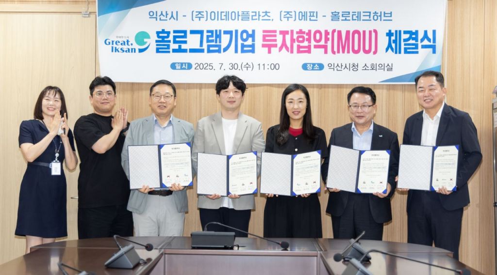 협약식에는 정헌율 익산시장과 양사 대표, 최대규 전북디지털융합센터장이 참석했다. 이번 협약을 통해 시는 홀로그램 기술 기반 미래산업 육성과 첨단기업 유치를 통해 지속 가능한 산업 생태계 조성에 나설 방침이다.