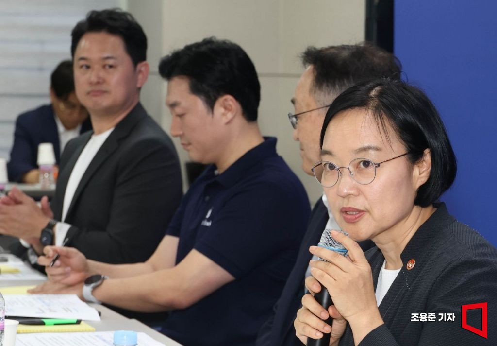 한성숙 중소벤처기업부 장관이 30일 서울 종로 소진공 서울중부센터에서 열린 ‘제1회 소상공인 회복 및 안전망 강화를 위한 릴레이 간담회’에서 발언을 하고 있다. 이날 간담회에는 소상공인을 비롯해 소상공인연합회장, 전국상인연합회장, 외식업중앙회장, 수퍼마켓협동조합연합회장 등이 참석했다.