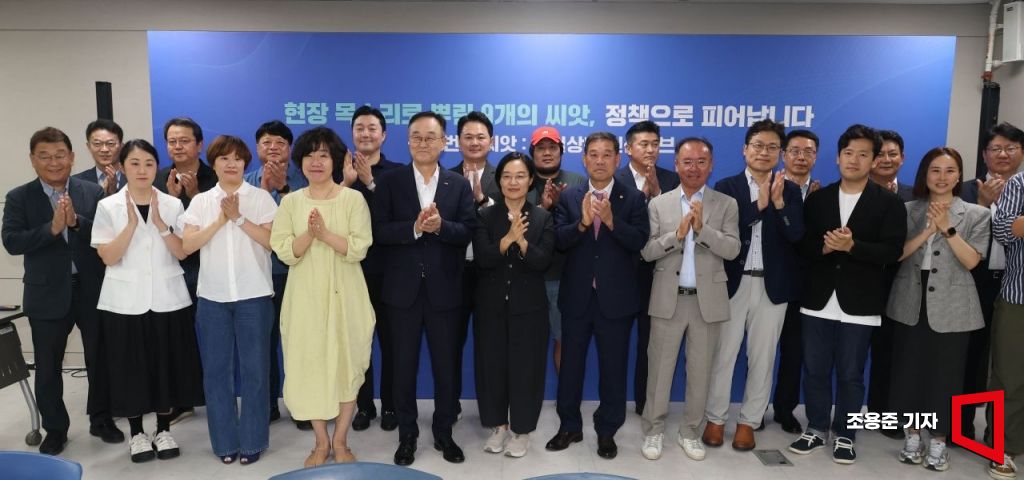 한성숙 중소벤처기업부 장관을 비롯한 참석자들이 30일 서울 종로 소진공 서울중부센터에서 열린 ‘제1회 소상공인 회복 및 안전망 강화를 위한 릴레이 간담회’에서 기념촬영을 하고 있다.