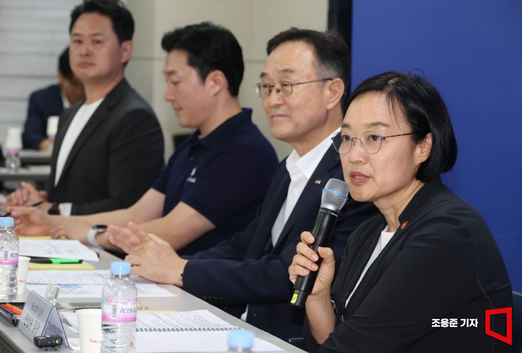 한성숙 중소벤처기업부 장관이 30일 서울 종로 소진공 서울중부센터에서 열린 ‘제1회 소상공인 회복 및 안전망 강화를 위한 릴레이 간담회’에서 발언을 하고 있다. 이날 간담회에는 소상공인을 비롯해 소상공인연합회장, 전국상인연합회장, 외식업중앙회장, 수퍼마켓협동조합연합회장 등이 참석했다.