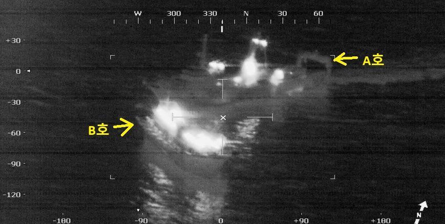 서해해경청 소속 항공기에서 적외선 열상 카메라(FLIR)을 이용, 불법 공조조업 의심 선박인 트롤어선(A)과 채낚기어선(B)을 항공 채증하고 있다. 서해해경 제공