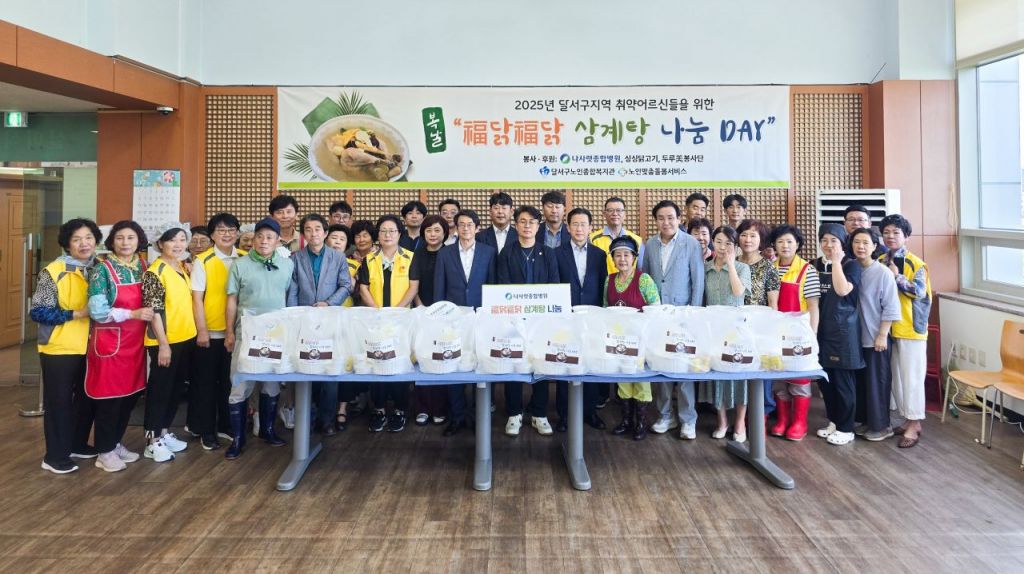 달서구노인종합복지관은 지난 29일 중복을 맞아 지역 내 소외되고 홀로 여름을 나는 600여명의 어르신들을 대상으로 ′福닭福닭 삼계탕 나눔 Day′ 행사를 개최했다.