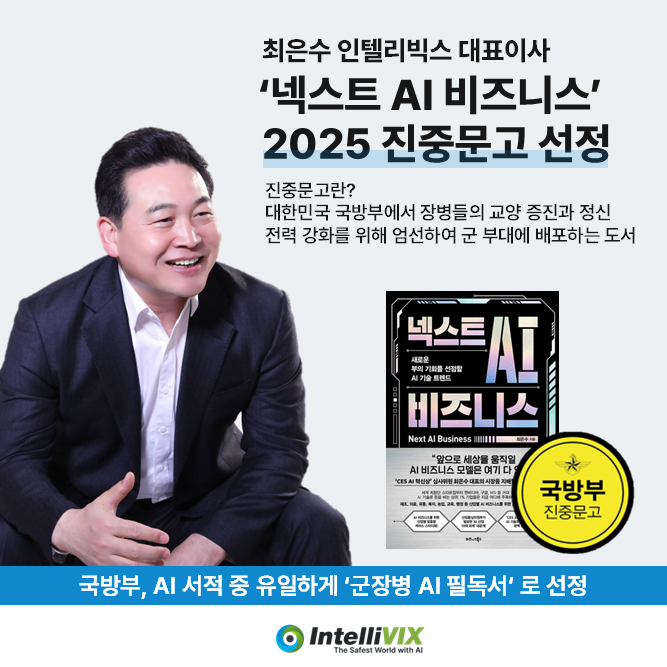 생성형 비전 인공지능(AI) 전문 기업 인텔리빅스의 최은수 대표가 저술한 '넥스트 AI 비즈니스'가 국방부 선정 '2025년 상반기 진중문고'에 선정돼 전군에 배포됐다. 넥스트 AI 비즈니스는 AI가 바꿔놓을 미래 비즈니스와 사회상을 담아냈다.