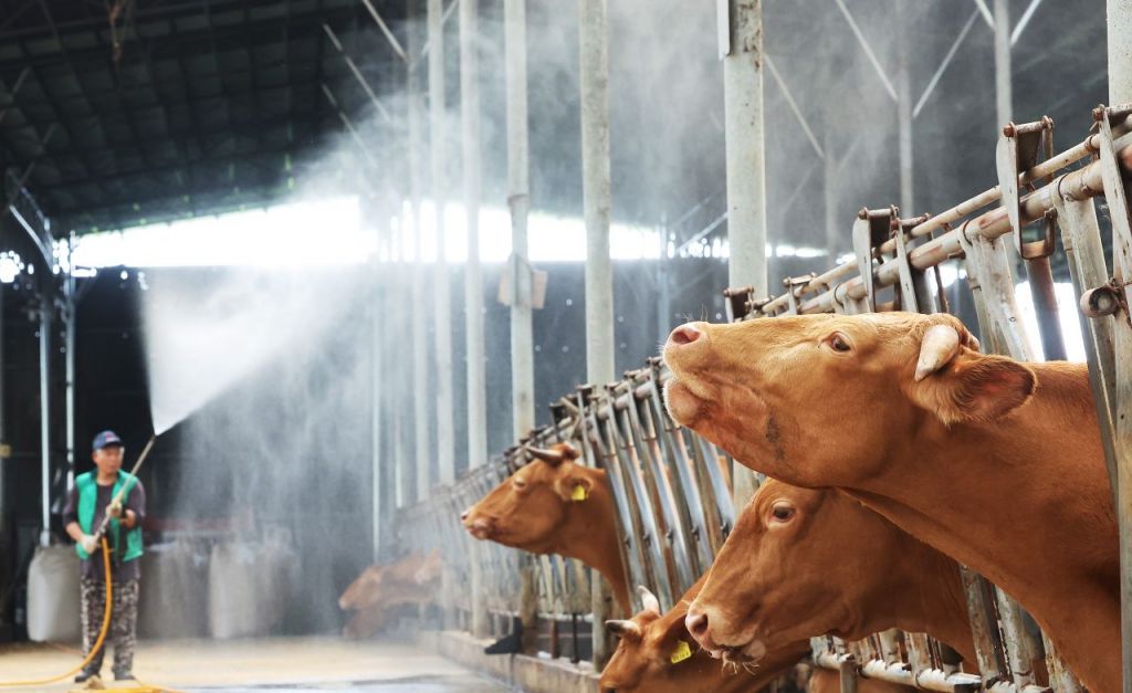 절기상 중복인 30일 경기도 화성시 산우리한우농장에서 소들이 농장주가 뿌려주는 물을 맞으며 더위를 식히고 있다. 연합뉴스