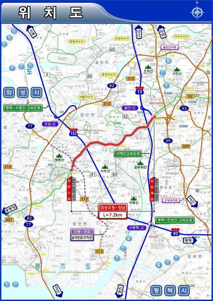 경기도 화성시 장안면 어은리와 향남읍 제암리를 연결하는 총 7.27km 구간 왕복 4차로 확장 공사 위치도