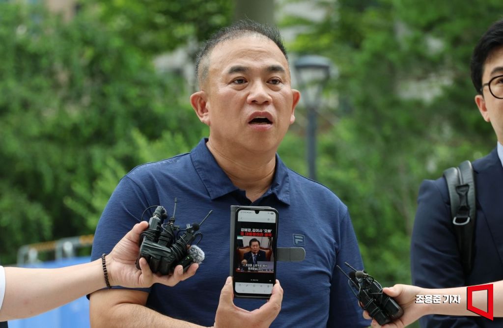 공천개입 의혹을 받는 정치 브로커 명태균씨가 31일 뇌물공여 혐의 피의자 신분으로 조사를 받기 위해 서울 종로구 KT빌딩에 마련된 김건희 특검 사무실로 출석하며 핸드폰을 들어 보이고 있다.